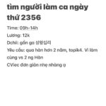 quán cơm và tok petal tìm người làm ca ngày thứ 2356 time: 9h-14h Lương: 12k Dchi: gần ga 상왕십리 Yêu cầu: qua hàn hơn 2 năm, topik4. Vì làm cùng vs 2 ng Hàn Cviec đơn giản nhẹ nhàng