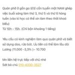 Quán phở ở gần ga 삼성 cần tuyển nam ghép việc buổi sáng làm thứ 3,5,6 hàng tuần ( kì nghỉ có thể xin làm theo thời khóa biểu) Từ 10h-15h( chỉ bận khoảng 1 tiếng) Yêu câu có kinh nghiệm làm qua quán phở và biết sử dụng dao, rửa bát. Ưu tiên có thể làm lâu dài Lương ( 11000- 3,3%)~ 10.700 Mn liên hệ trực tiếp với chủ nhé Sdt bà chủ: 01043303527